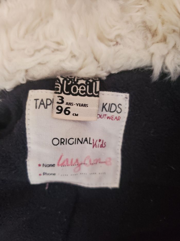 Manteau de la marque Tape à l'œil, taille 3 ans 96cm. Aucune taches (juste prénom de l'enfant écrit sur l'étiquette prévu à cet effet) ni trou, de petites boulloches principalement sur les manches très peu visible.