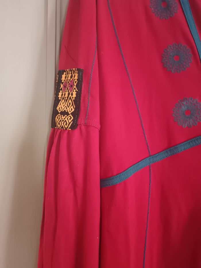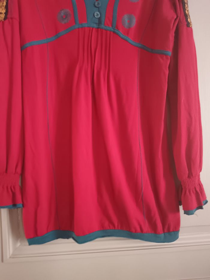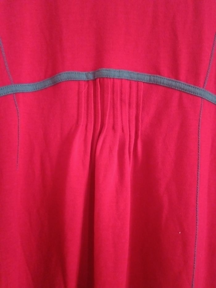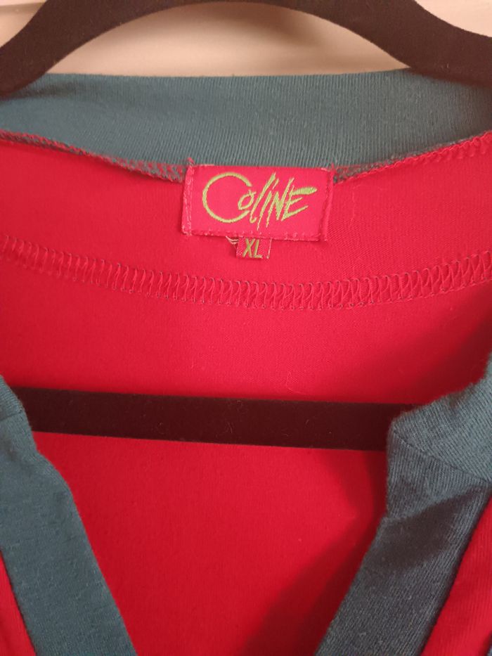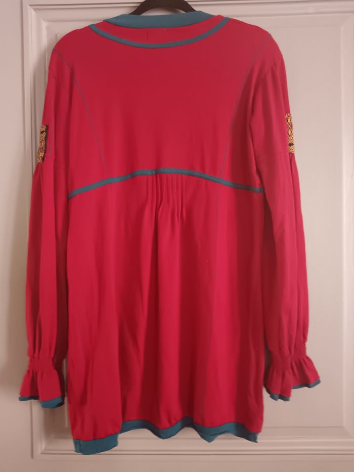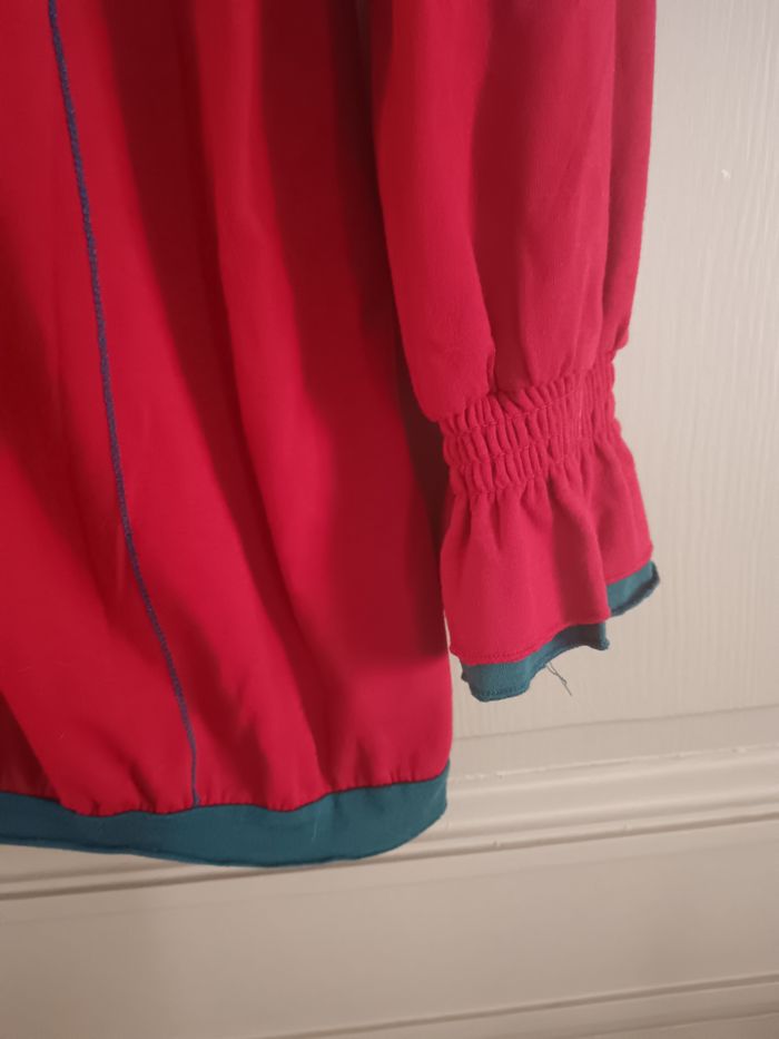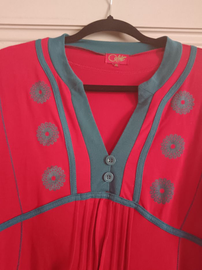 Joli haut Coline, rouge et bleu canard, écussons sur le côté des bras, bas des manches froncé. Taille XL , aisselles à aisselles : 50cm, longueur : 80cm . Taille grand.