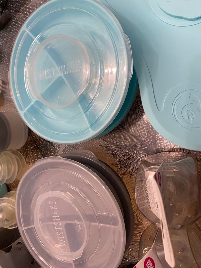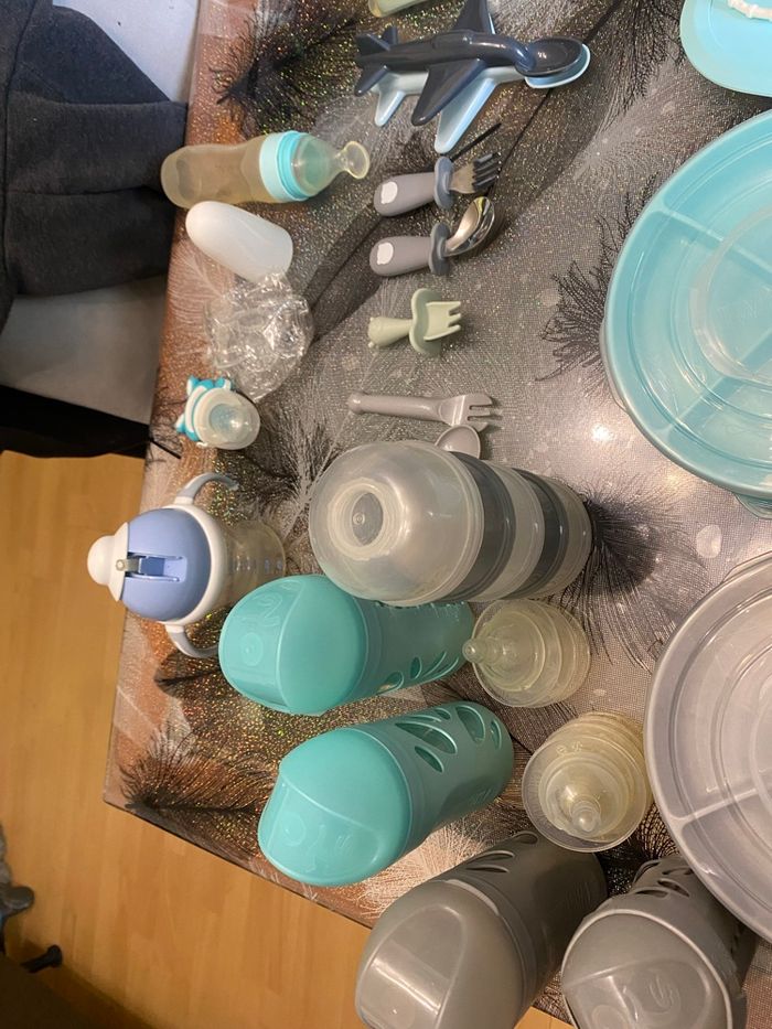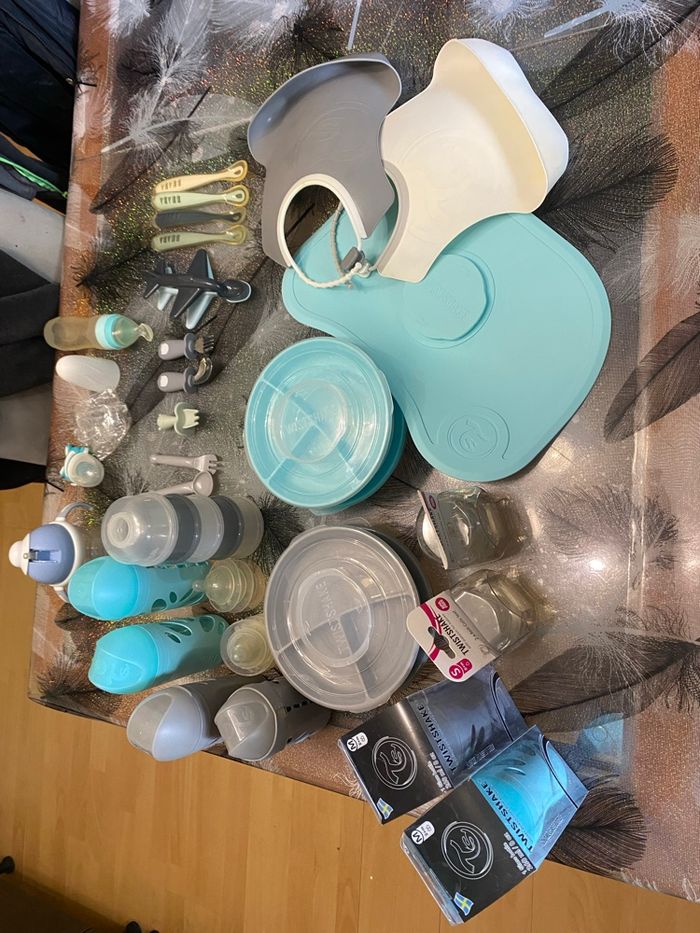 Deux Biberons en verre protection en silicone emballé neuf Taille M 2mois+ 260ml 3 biberons en verre protection en silicone utilisé 260ml 4 tétine neuve en 0M+ taille S + plusieurs tétine de rechange (utilisé) 1 rechange en silicone pour biberon 4 assiettes avec couvercles dont deux à compartiment + le tapis antidérapants 2 bavoirs Autre marques : Grignoteuse 4 embout dont 3 neuve Biberons cuillère Couvert d’apprentissage 1 doseur à poudre