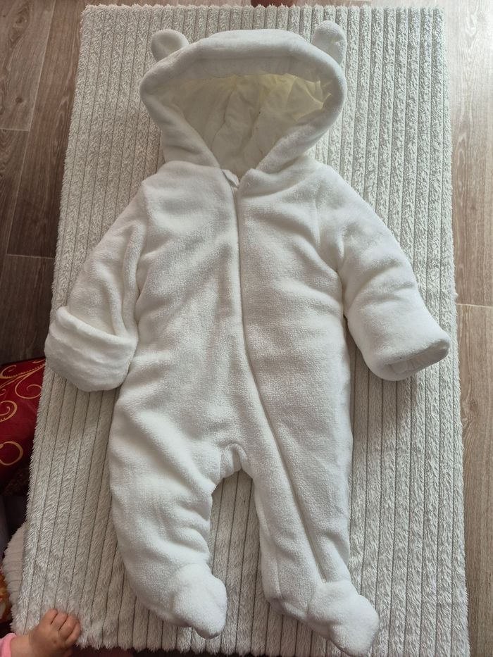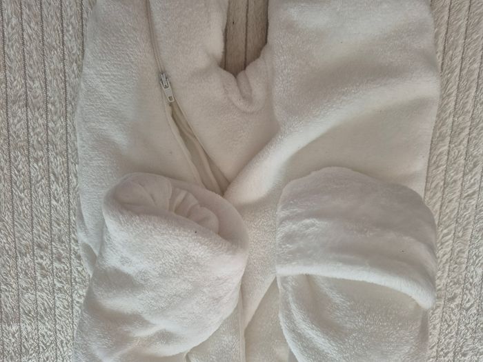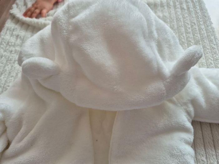 Combinaison polaire bébé épaisse, très peu porté, pas tâché. Décousu légèrement au niveau de la fermeture éclaire. Oreilles sur la capuche, moufles sur les mains.