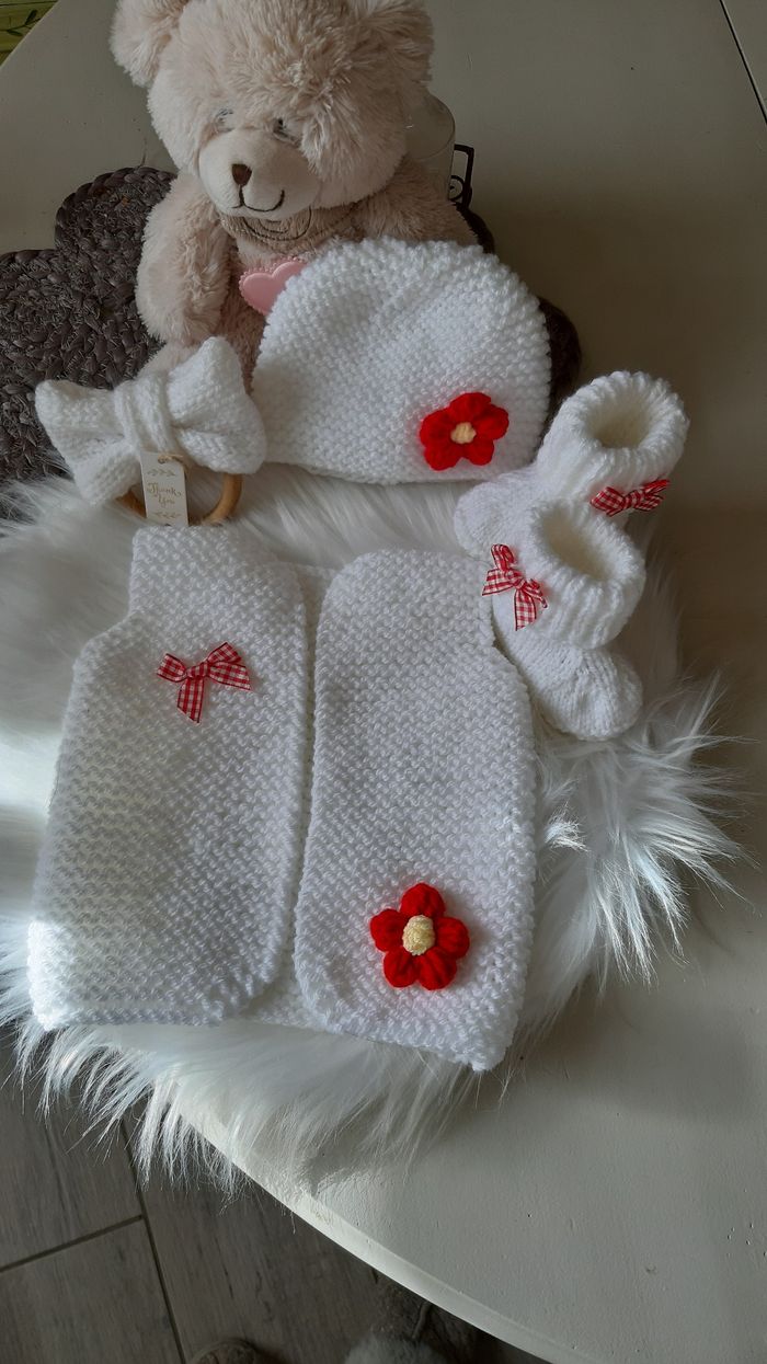 Fait main au tricot Ensemble 3 pièces Gilet berger, chaussons, bonnet ou bandeau