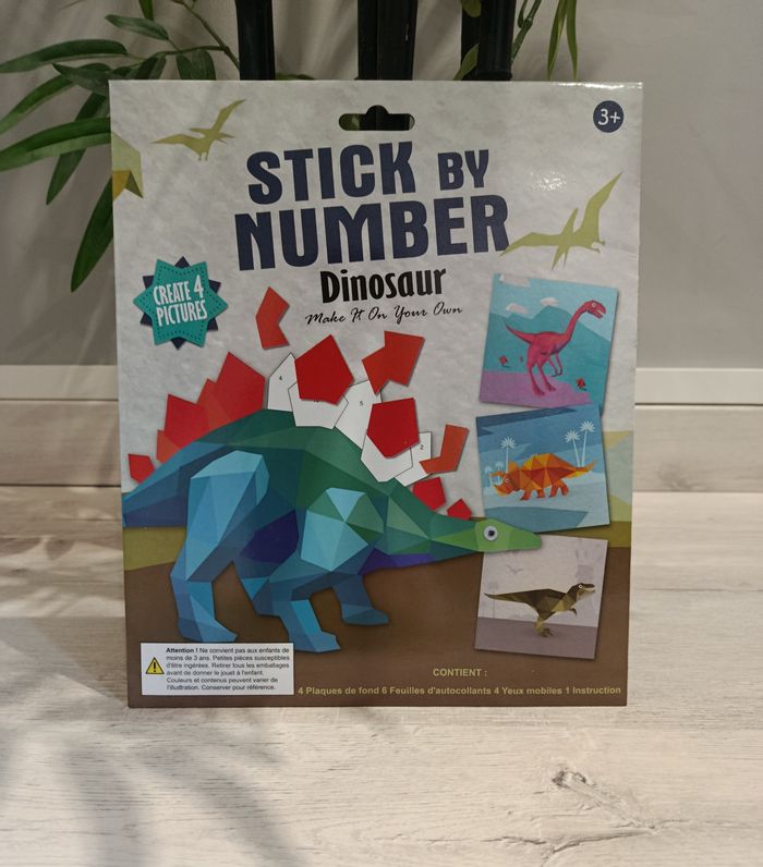 Mosaïque par numéro dinosaure. Set de 4 cartes d'autocollants. Ensemble d'autocollant à coller en suivant les numéros. Idéal pour occuper le temps des enfants et faire travailler leur concentration et leur patience. Neuf sous emballage