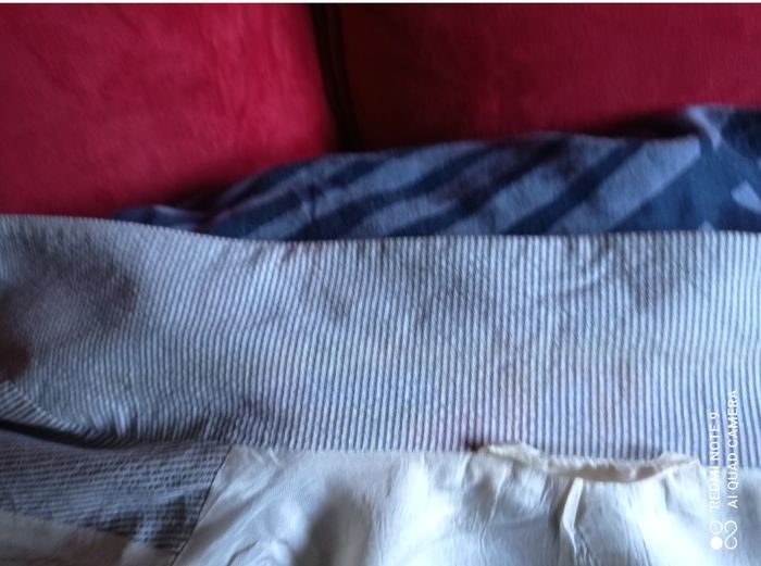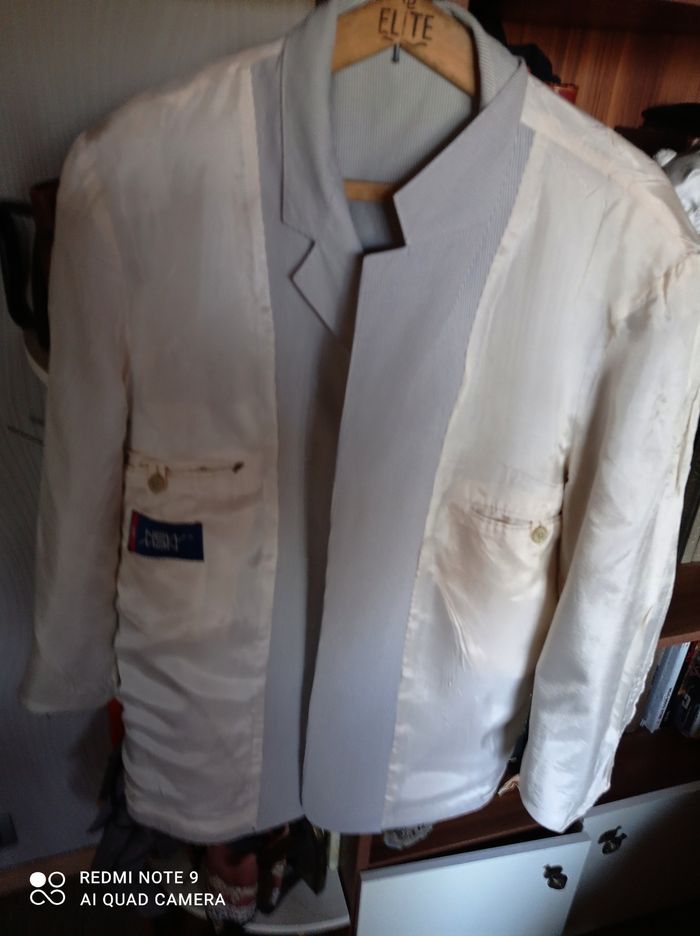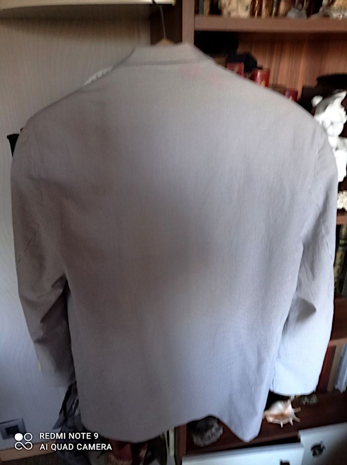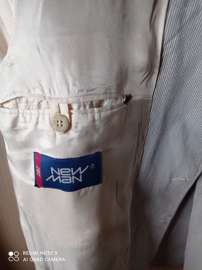 Veste Marque "NewMan" polyester/coton à fines rayures Fermeture 2 boutons-Col montant-2poches extérieures-2 poches intérieures 1/2 tour poitrine =55.5/1/2 tour de taille=52/Epaule à Epaule=47.5 Longueur du Dos 78.5 Se porte facilement avec un jean Peux se laver en machine