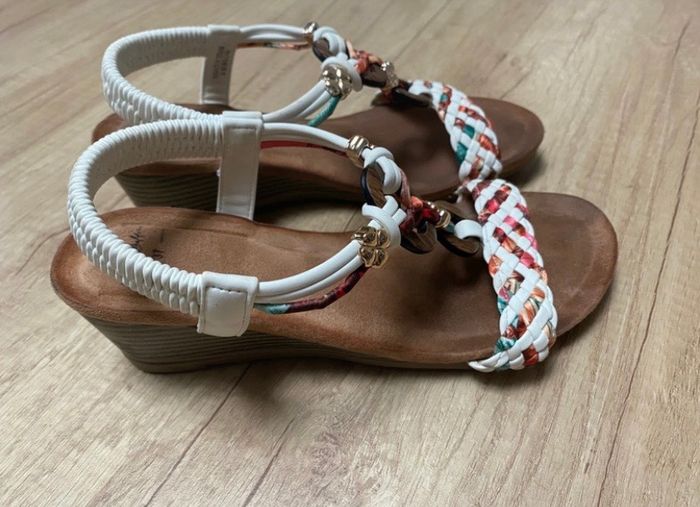 Sandales compensées avec bride talon élastique et bijou fantaisie blanc. Insertion facile du pied. Bride talon élastique. Semelle intérieure moussée. Talon compensé de 7 cm. Taille 37.