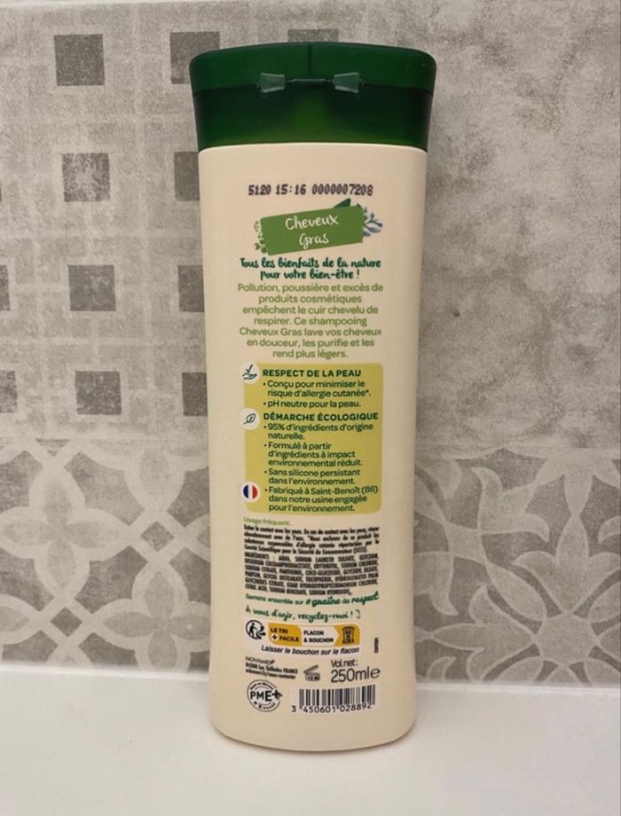 Shampooing cheveux gras parfum raisin et thé vert 250ml. Neuf.
