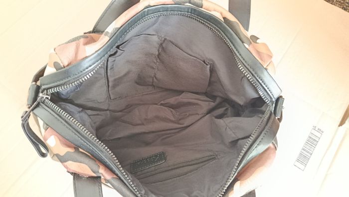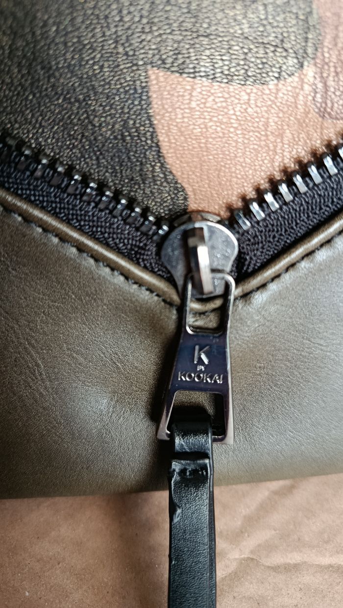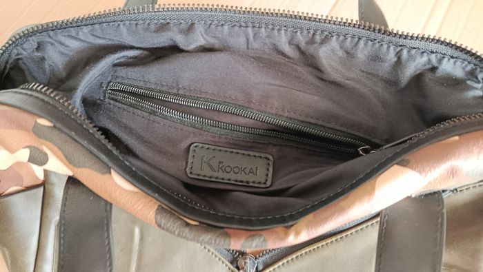 Sac à main Kookaï, vert et camouflage Poignées mains, Fermeture zippée (sans de bandoulière) Doublure noir avec logo et différents espaces Très bon état Longueur: 35 cm, largeur: 18 cm, hauteur: 23 cm
