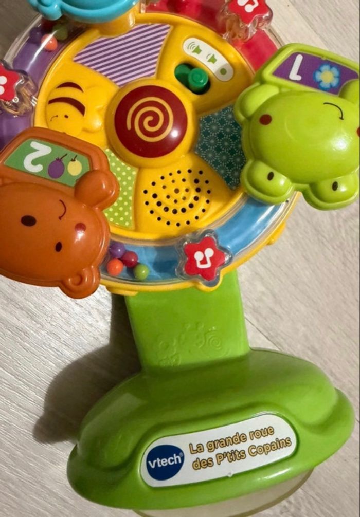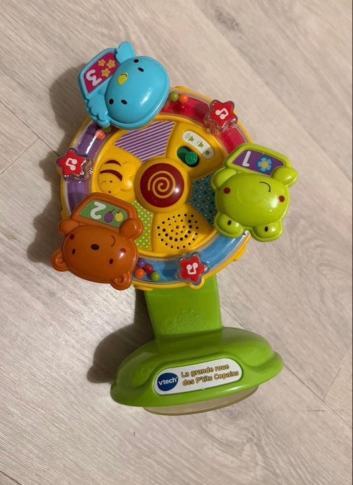 Jouet musical VTECH Bébé fait tourner la roue et déclenche des sons rigolos et des mélodies. Les 3 étoiles lumineuses attirent l'attention de Bébé. La lumière clignote en rythme avec les sons. 3 boutons Animaux (ours, grenouille et oiseau) pour découvrir leur nom, leur couleur, des objets et les premiers chiffres. 10 mélodies et 5 chansons. Avec ventouse de fixation. Réglage du volume sonore. Fonctionne avec 2 piles LR03 fournies.