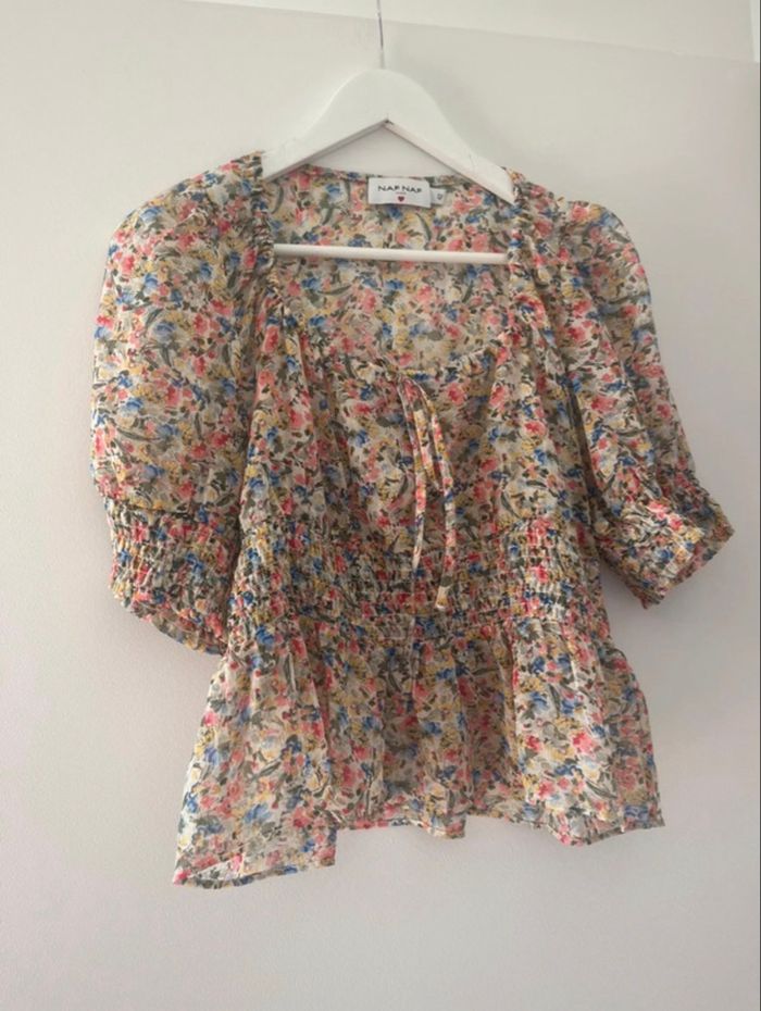 Chemise fleurie avec petite manches bouffantes , lien poitrine et taille marquée .polyester. Neuf
