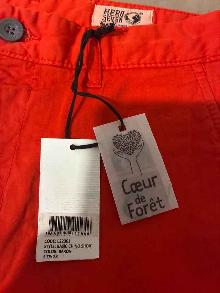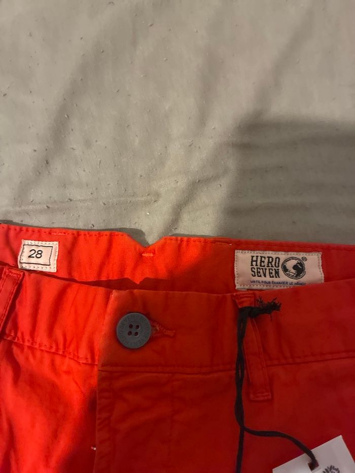 Vends short type chino de la marque Hero Seven, totalement neuf avec ses étiquettes. • Taille : 28 (correspond à un XS/S ou 36/38, idéal ado). • Couleur : Rouge "Baron" (très lumineux). • Matière : 100% coton de belle qualité. • État : Neuf, jamais porté.