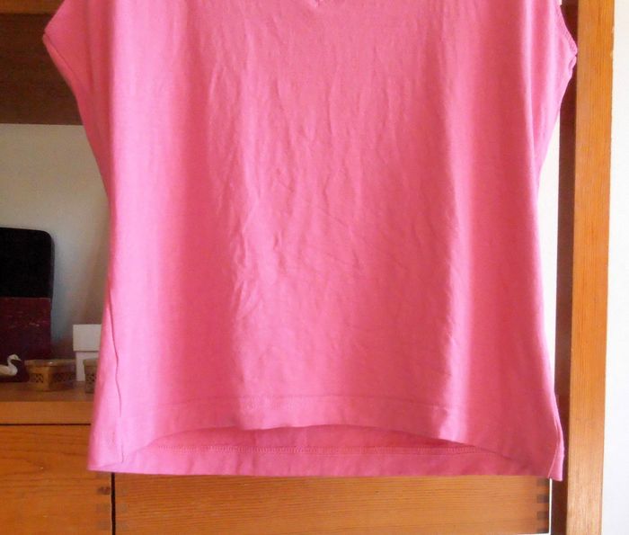 T-shirt femme, taille L/40, couleur rose. Col en V stylé, manches courtes, tissu léger, fluide, agréable à porter. Très bon état. Parfait pour printemps/été !