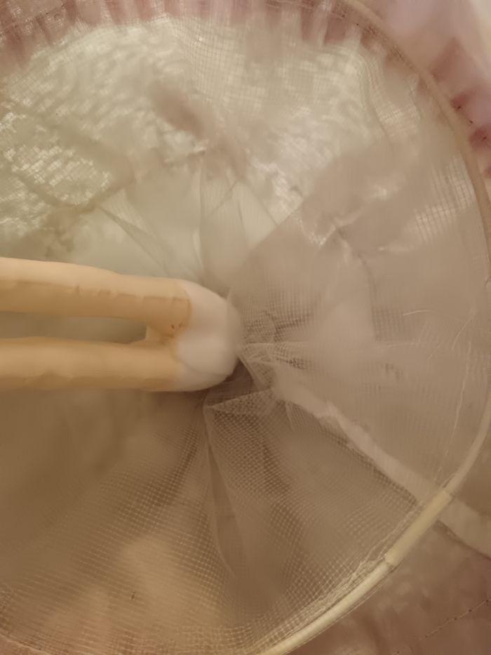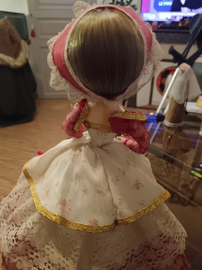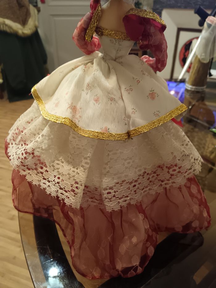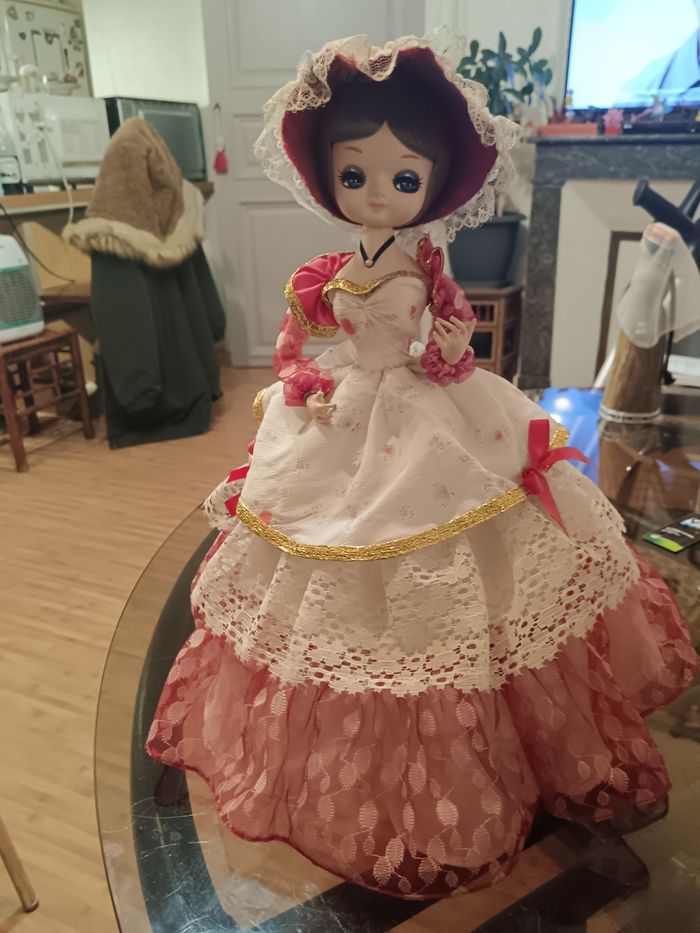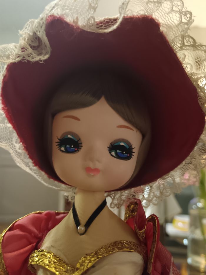Poupée en tissu Bradley Artmark Big Eyes « Tina » Southern Belle robe rouge et blanche, sur socle, 35,5 cm de haut, vintage des années 1970. Fabriquée en Corée.