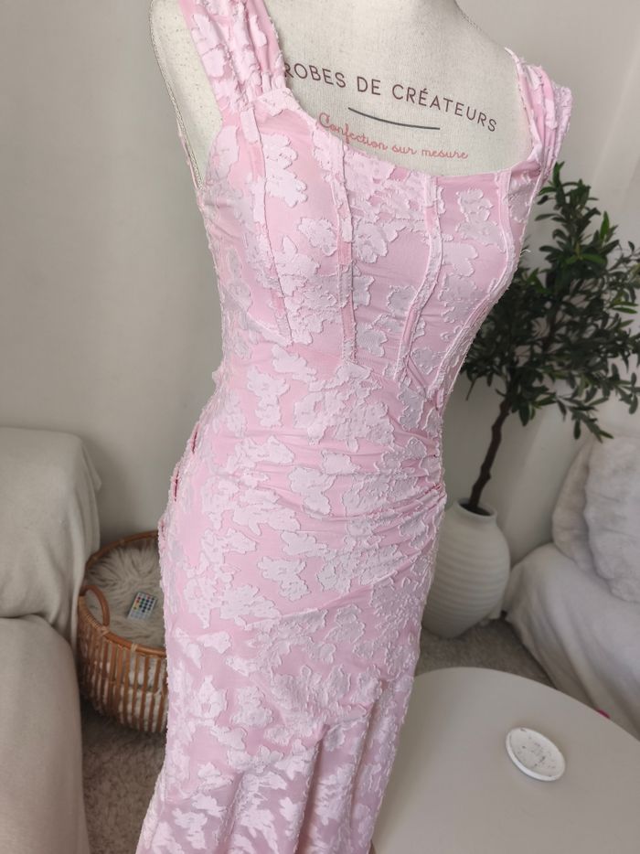 Robe élégante rose avec effet dentelle et coupe près du corps. Bas asymétrique avec volant, très féminin et flatteur. Bretelles larges, joli décolleté carré. Parfaite pour une occasion ou une soirée. Taille S. En parfait état, comme neuve.