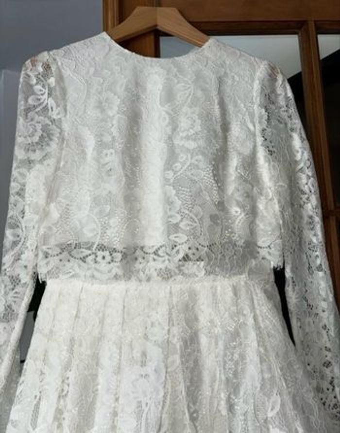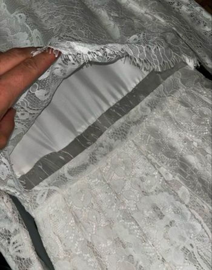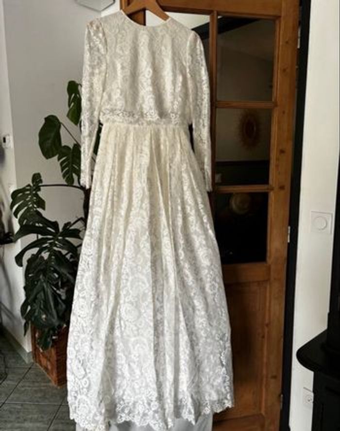 Jolie robe de mariée portée juste quelques heures pour mon mariage civile. Achetée en septembre 2022 sur le site Asos au prix de 179€. Elle taille très bien, elle est de bonne qualité. Je n’ai eu que des compliments ! Vous avez une petite partie transparente autour de la taille mais c’est très léger puisque la dentelle cache le tout. Les bras sont en transparence également. Portée on pourrait même croire que c’est un haut + une jupe. Fermeture à zip discrète dans le dos. Sac de transport et cintre en bois d’origines fournis. Taille : 38 Couleur : ivoire