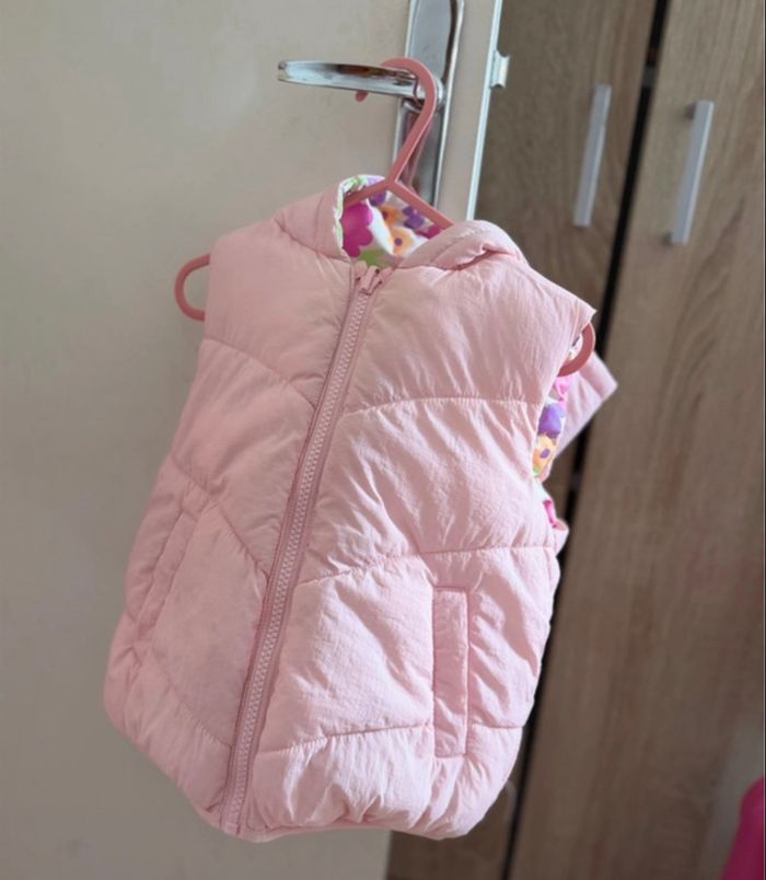 Très jolie doudoune sans manches rose, idéale pour la mi-saison 🍂🌷Intérieur coloré avec motifs fleurs, super mignon tu peux aller jusqu’à du trois ans