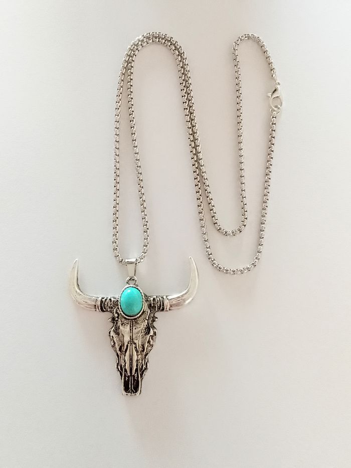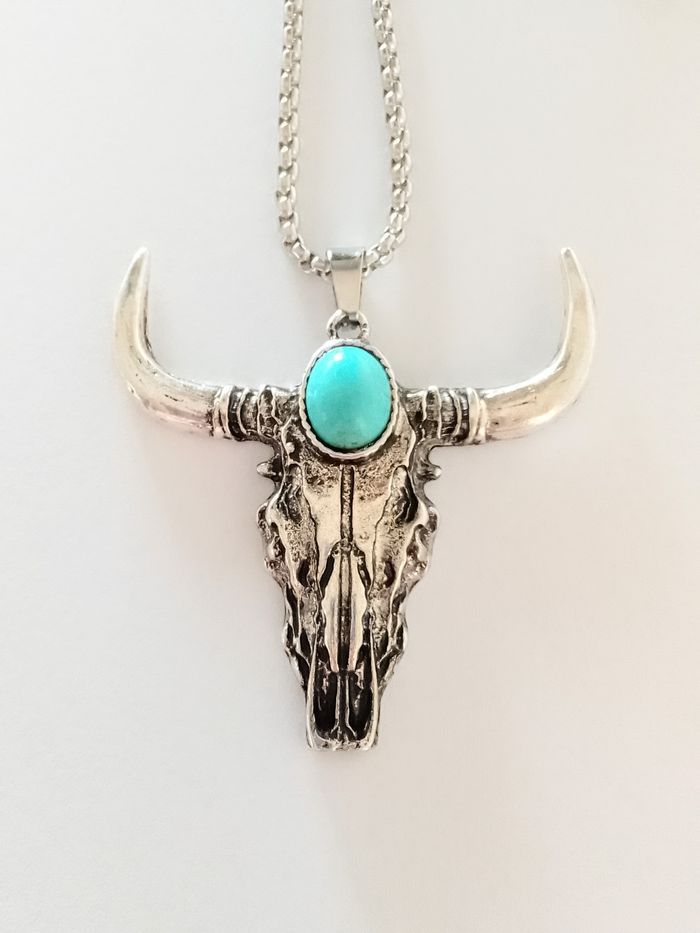 Chaîne + pendentif bohème. Pendentif : tête de taureau. (bohème, spirituel, protection, idéal cadeau) DESCRIPTIF : Couleur : argenté, turquoise. Taille chaîne : 60 cm Diamètre pendentif : 4,5 cm L * 4 cm H Envoi rapide et soigné.