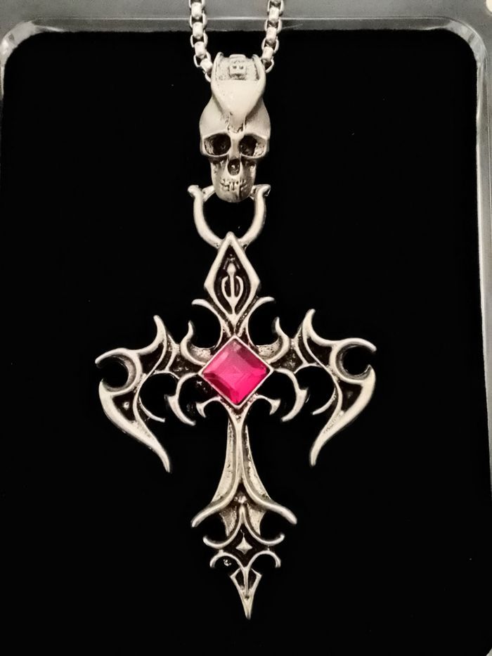 Chaîne + pendentif gothique. Pendentif : croix gothique, tête de mort. (gothique, religieux, protection, spirituel, celtique, skull, idéal cadeau) DESCRIPTIF : Couleur : rouge, argenté. Taille chaîne : 60 cm Diamètre pendentif : 3,5 cm L * 7,5 cm H Envoi rapide et soigné.