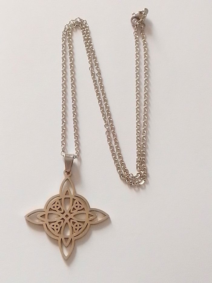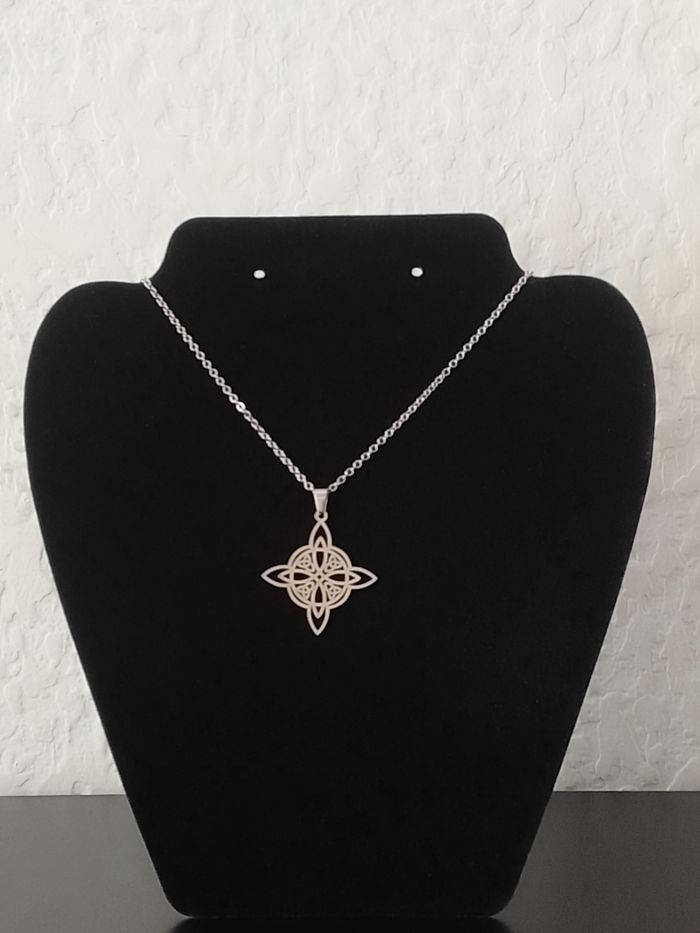 Chaîne + pendentif celtique. Pendentif : noeud de sorcière, motif : noeud celtique. (celtique, spirituel, protection, élégant, idéal cadeau) DESCRIPTIF : Couleur : argenté. Taille chaîne : 50 cm Diamètre pendentif : 3,5 cm L * 3,7 cm H Envoi rapide et soigné.