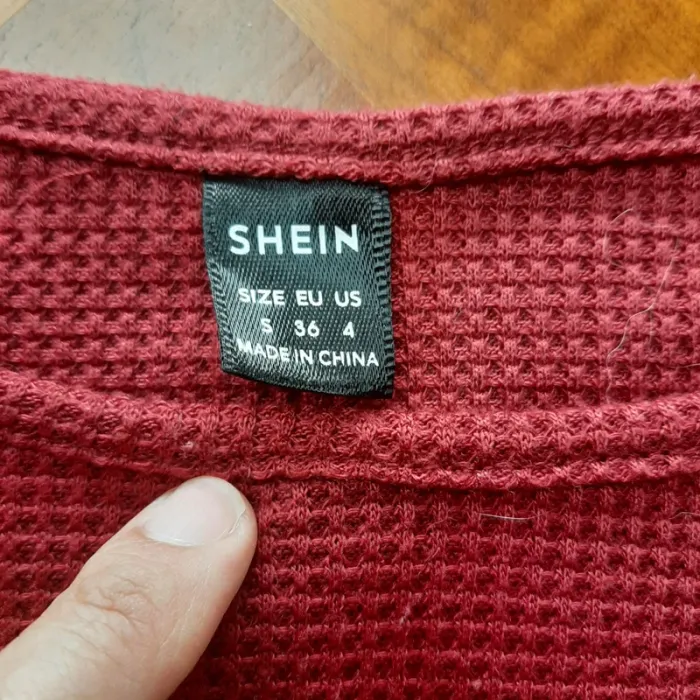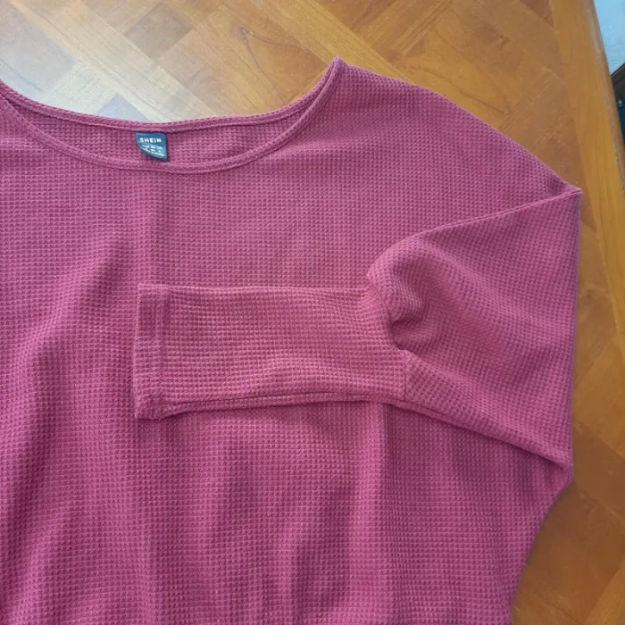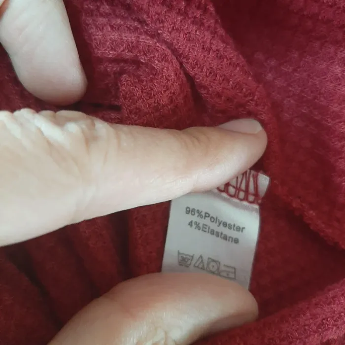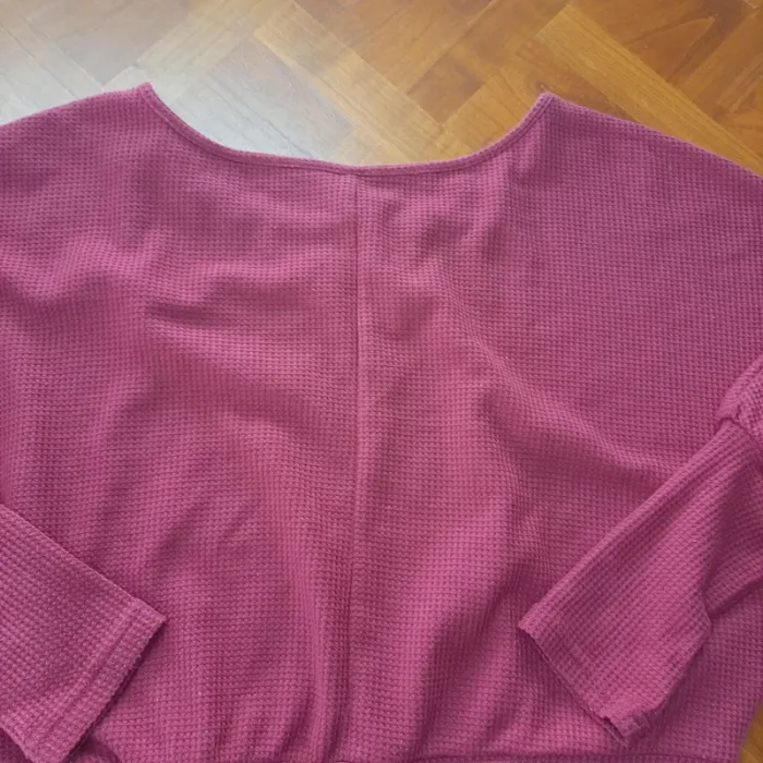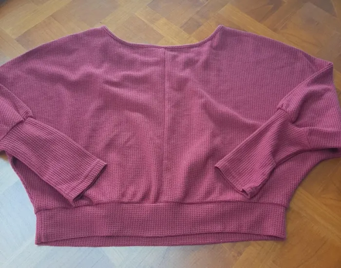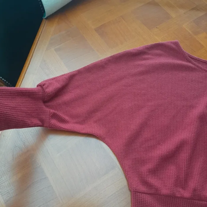 Crop top en maille gaufrée rouge foncé. Manches 3/4 chauve-souris. Encolure bateau. Composition : polyester/élasthanne Très peu porté. Excellent état, sans défaut, ni taché.