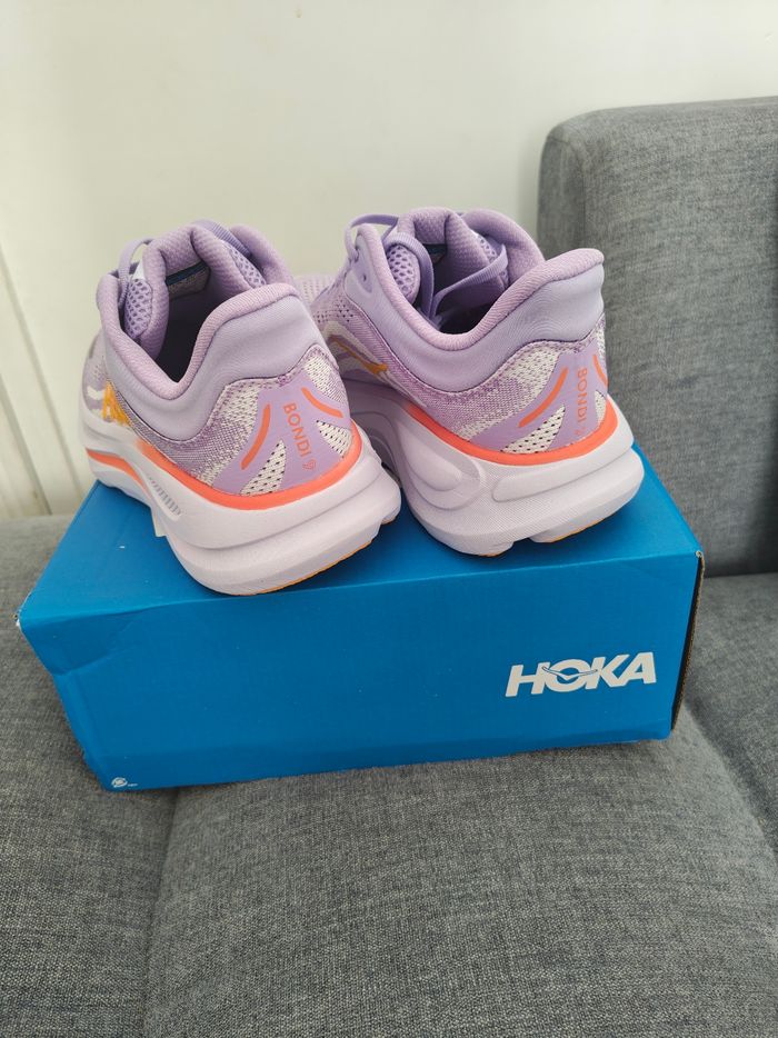 Hoka bondi 9 Couleur violet orange Taille : 39 1/3 Basquette de runing ou de marche Très agréable et légère à porter Jamais porté