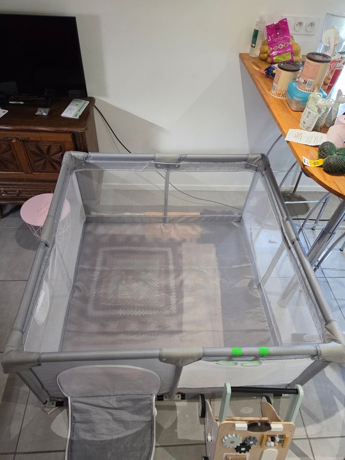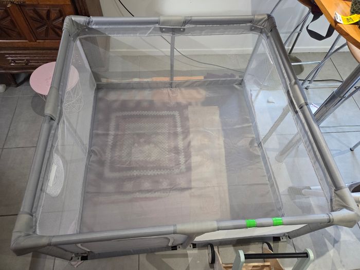Parc bébé carré 120x120 cm acheté sur Amazon, idéal pour sécuriser bébé et lui laisser de l’espace pour jouer. Structure solide avec côtés en filet pour garder un œil sur bébé. Facile à monter et démonter, peu encombrant une fois plié. Couleur gris, mixte. Très bon état Envoie rapide et soigné 📦