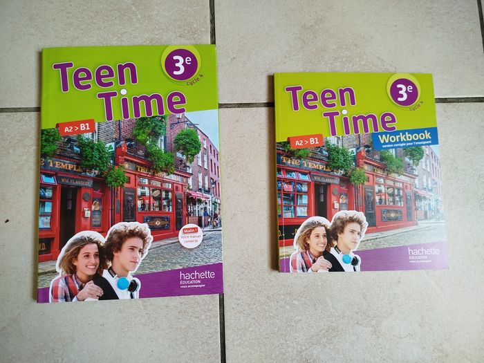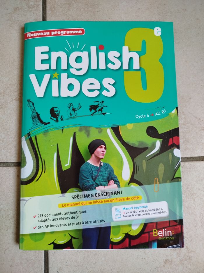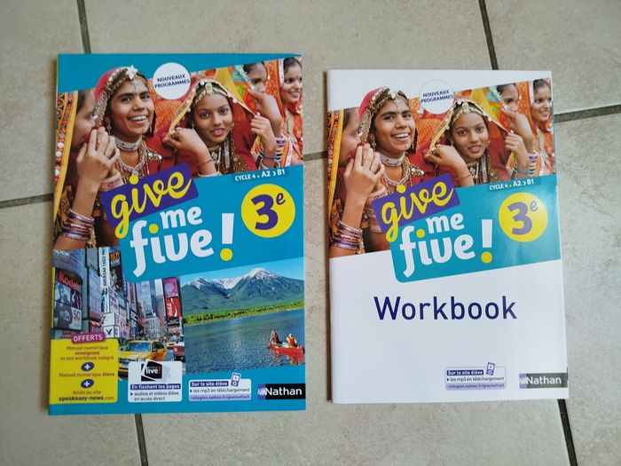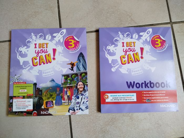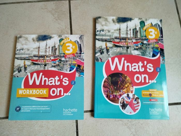 Différents manuels et workbooks (cahiers d'activités de classe) correspondant entièrement neufs. Ce sont tous des spécimens enseignant identiques aux exemplaires élève sauf si mention "corrigé" indiquée. - Give me five 3e, manuel + workbook, édition 2017 - So English 3e, manuel, édition 2017 - What's on ... 3e, manuel + workbook corrigé, édition 2017 - Teen time 3e, manuel + workbook corrigé, édition 2017 - English Vibes 3e, manuel, édition 2017 - English Tracks 3e, cahier-livre, édition 2018 - I bet you can ! 3e, manuel + workbook corrigé, édition 2020 5€ l'un, manuel ou workbook. Si vous souhaitez d'autres photos ou renseignements, n'hésitez pas. Autres manuels d'anglais d'autres niveaux en vente.