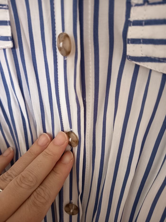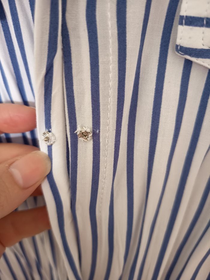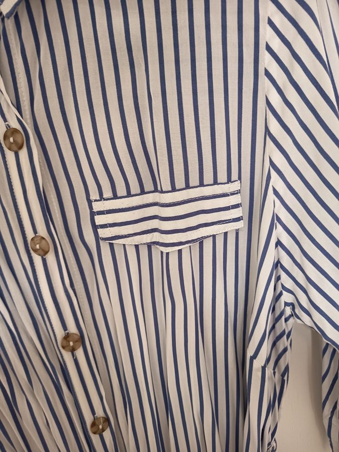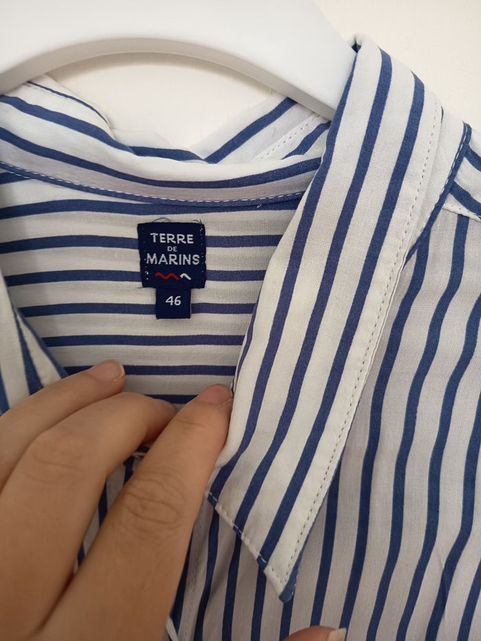 Robe chemise de chez terre de marin Tissus ultra léger et fluide Porté une seule fois, une matinée Taille 46 Robe avec poche et fendue des deux côtés. Poches devant faussbouton pression rajouter pour ne pas s'ouvrir à la poitrine Manche courte un peu longue Ceinture incluse Bleu et blanche #robechemise #terredemarins #robe