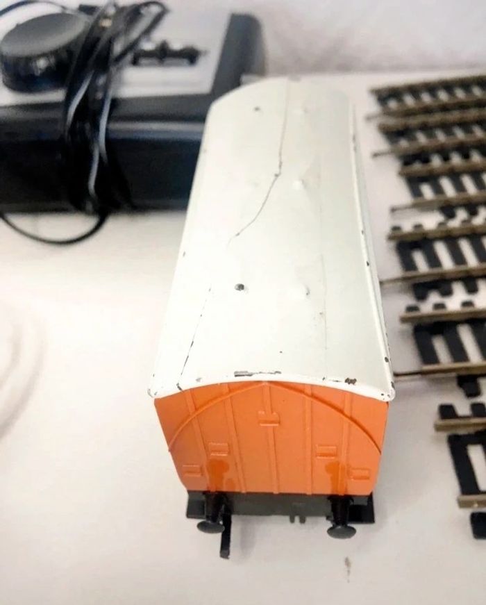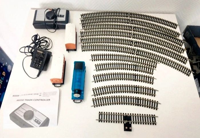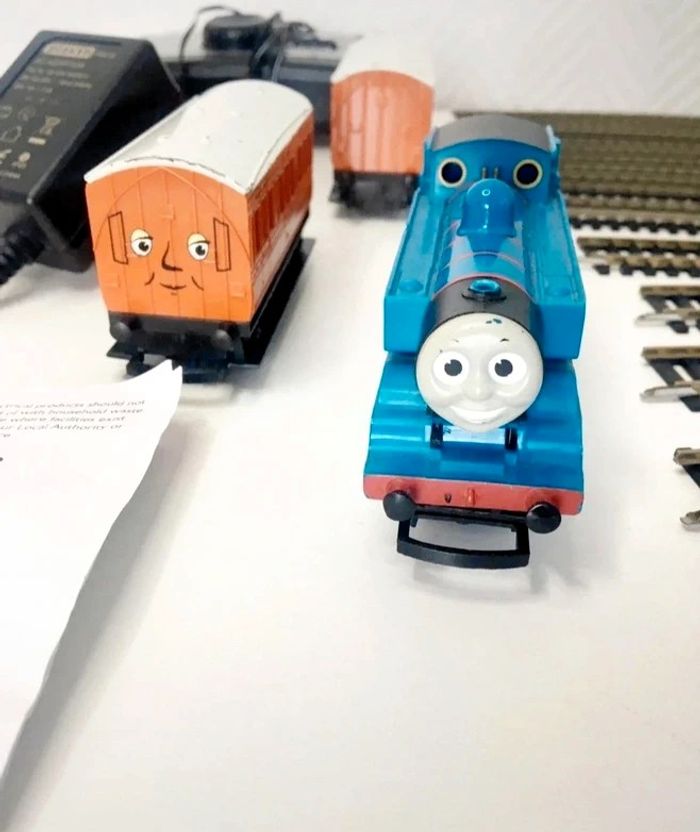 Circuit de train Hornby Thomas le train. - Type de produit : Trains - Marque : Hornby - Gamme / Licence : Thomas le train En bon état, avec des légers défauts d’utilisation et une fissure sur l’un des wagons (voir photos) Fonctionne