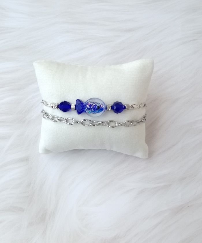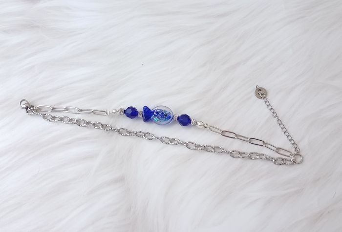 Bracelet-Tendance-Poisson 1 chaine maillons ovales ciselés 1 chaine maillons rectangulaire 1 perle poisson en verre bleu nuit 2 perles a facette bleu nuit Acier inoxydable Longueur : 18 CM + 5 CM de chainette Ajustable Très bon état