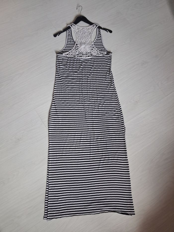 Robe longue taille M Couleur noir et blanc Broderie dentelle haut du dos Ouverture sur les 2 côtés bas 95% polyester et 5 % élasthanne Très très bon état