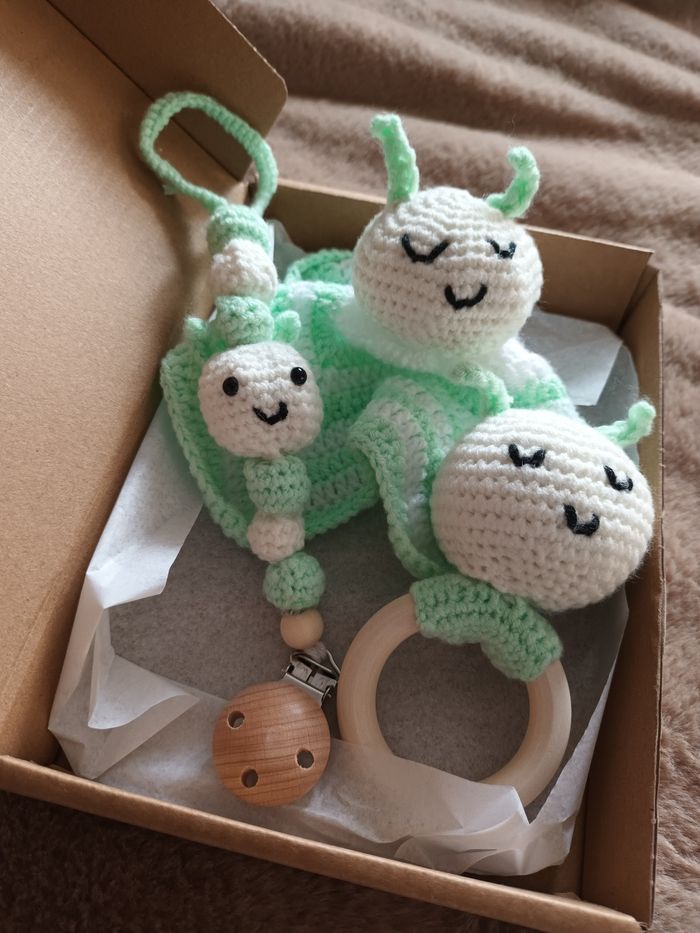✨Coffret naissance fait main au crochet ✨ Adorable ensemble sur le thème luciole 🧸 Le coffret comprend : 1 doudou 1 hochet 1 attache-tétine assortie 🎨 Couleurs douce: blanc et menthe 🧶 Réalisé entièrement à la main avec soin 🧼 Lavage à la main recommandé séchage à l'air libre A utiliser sous la surveillance d'un adulte 🎁 Idéal pour un cadeau naissance 📦 Envoi rapide et soigné Possibilité de vendre séparément