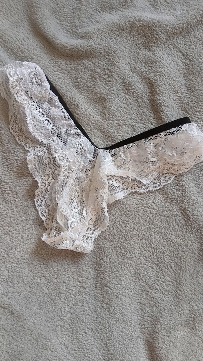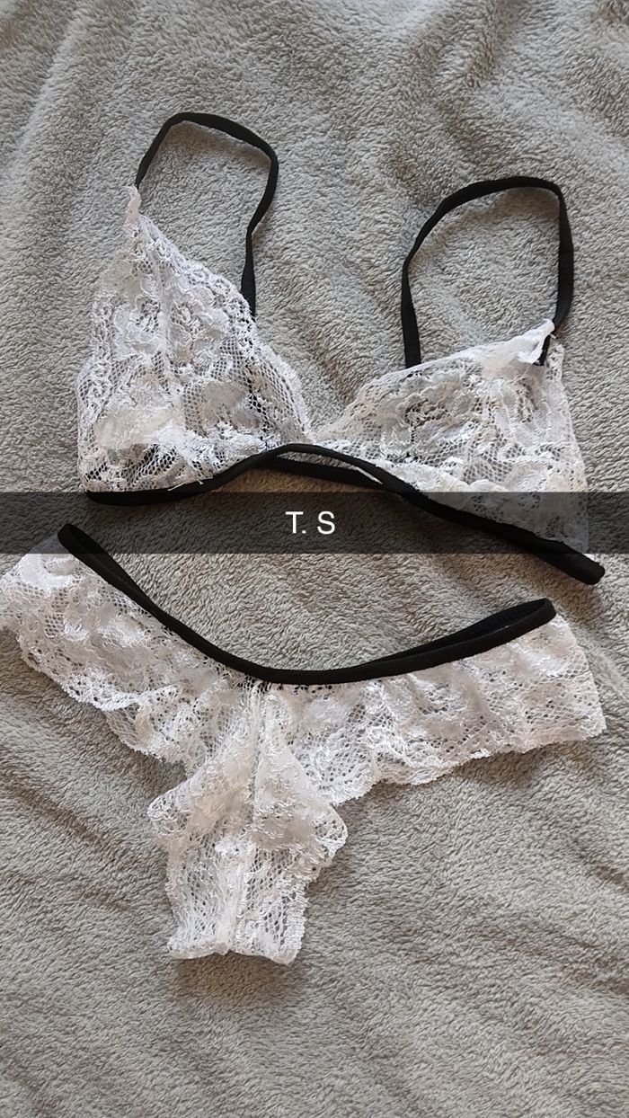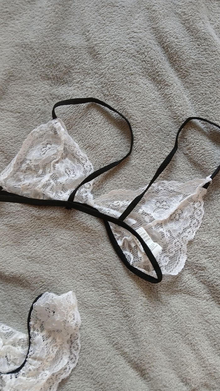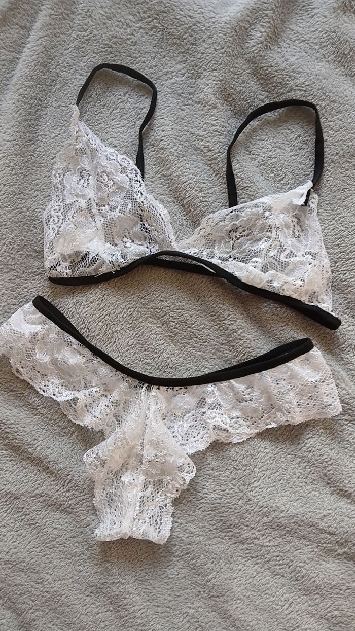 Ensemble lingerie blanc avec liserés noirs. Taille S, neuf sans etiquette, soutien gorge en triangle avec string.