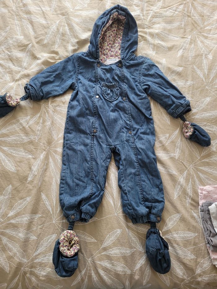 Combinaison en jean doublée tissu fleuri avec chaussons et moufles amovibles Marque verbaudet Taille 2 ans En excellent état