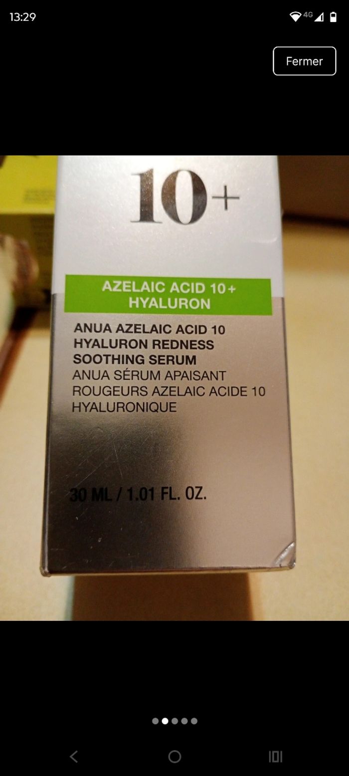 Sérum visage Anua Azelaic a l acide 10+ hyaluron Grâce à sa formule à faible irritation, ce sérum apaise délicatement les rougeurs causées par la sécheresse, laissant ta peau rafraîchie, équilibrée Jamais ouvert étiquette de sécurité dessus Expire en avril 2028 vu sur photo