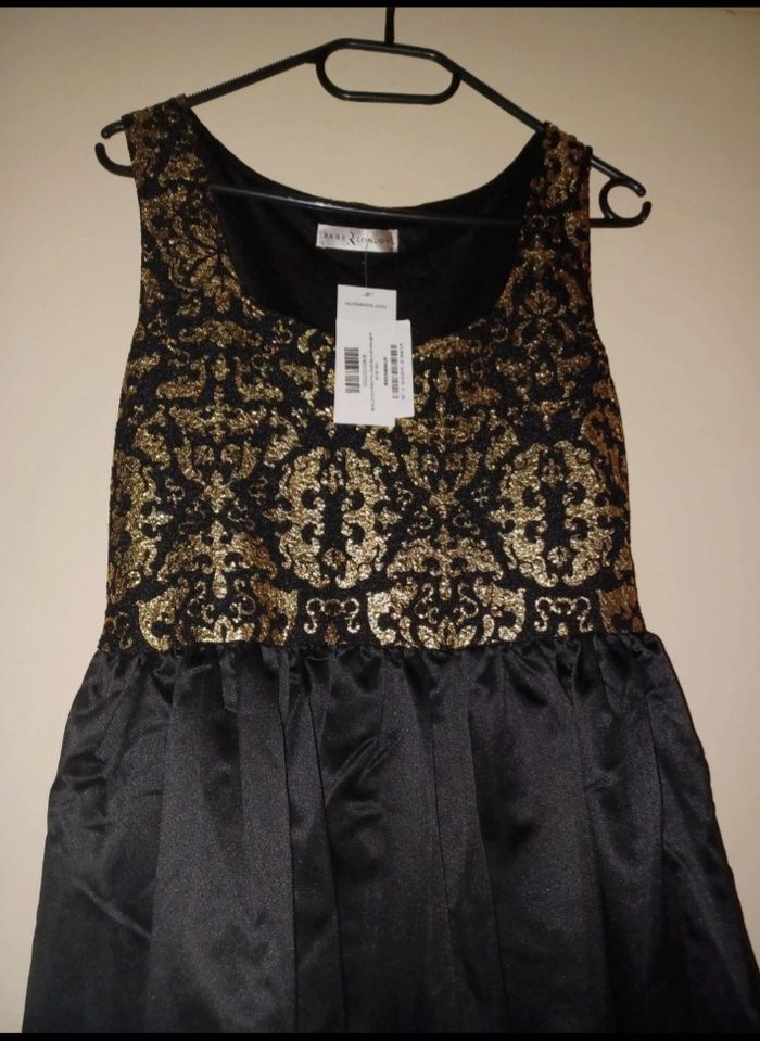 Robe sans manches Empiècement noir et or Bas en satin Longueur 94 cm Taille M/L (40) Mais taille petit Marque Rare london Neuve avec étiquette