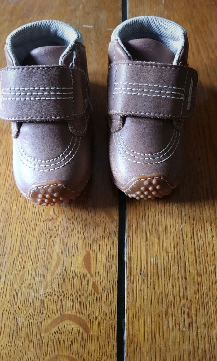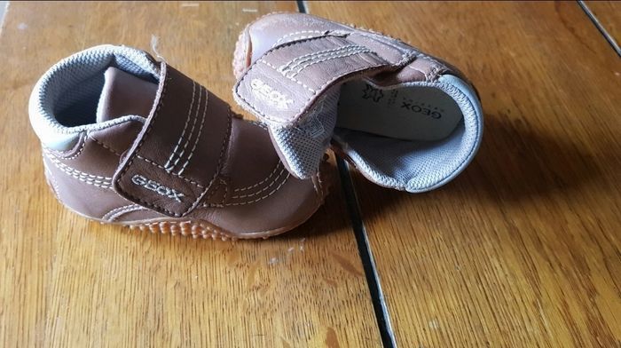 Chaussures GEOX avec scratch dessus et bonne accroche dessous pour faciliter les premiers pas de bébé. Semelles impeccables. De légères marques de frottement sur le côté d'une chaussure, mais TBE général Valeur neuf : 89e