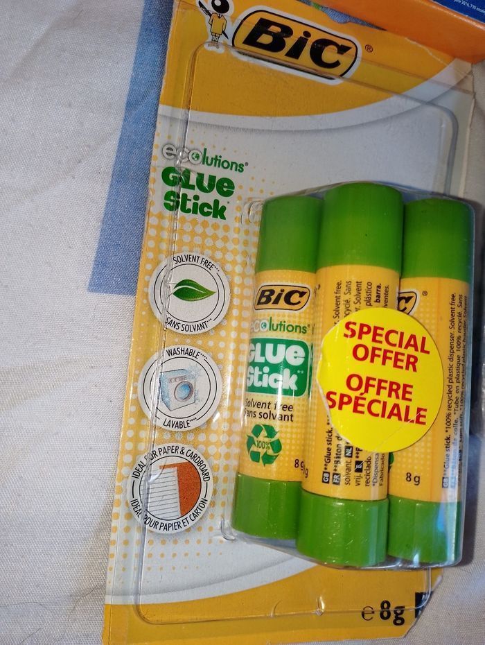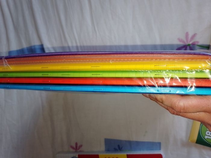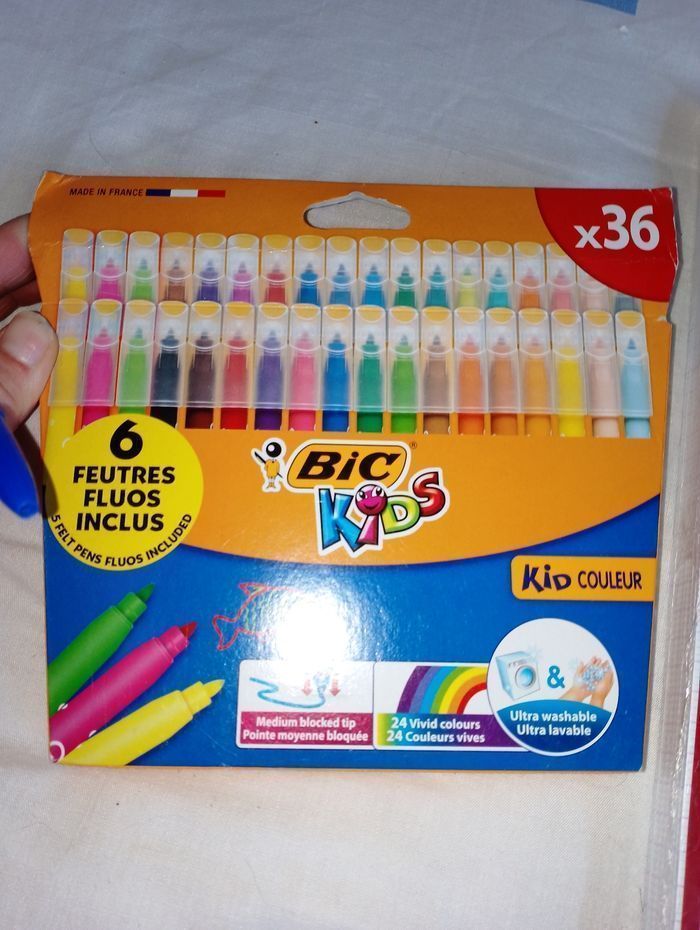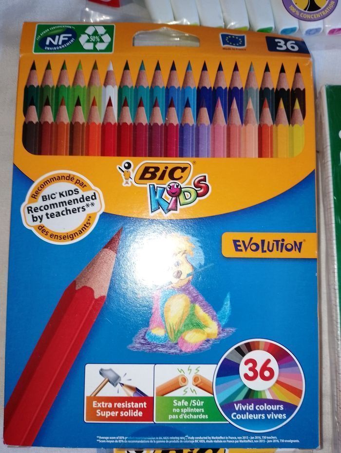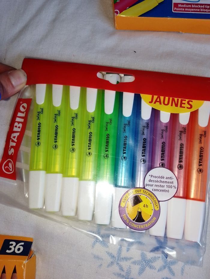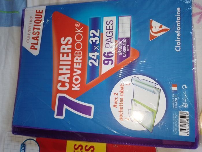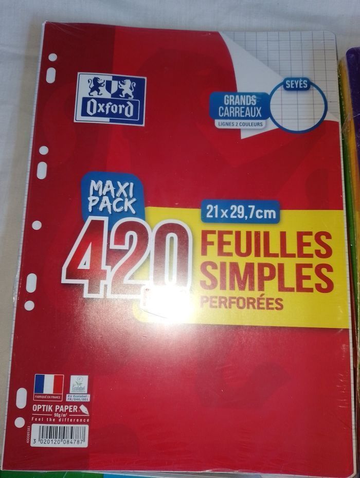 Lot collégien neuf # 420 feuilles simple oxford 21x29,7cm 7euro pièce #300 Copie double oxford 21x29,7cm 6euro pièce # lot de 7 cahier koverbook 24x32 avec 2 pochettes rabats Clairefontaine ## Plus d'emballage plastique mais neuf Il y a 1 second vert au lieu du blanc Coloris rouge, bleu, vert X2, jaune, violet et orange 25euro pièce # lot de 3 paquets de 12 feuilles de papier dessin blanc canson 180g/ M2 12euro pièce # Feutres bic kids couleur dont 6 fluos x36 6€ pièce # Crayon de couleur évolution x36 6euro pièce # Colle x 5 tubes bic 6euro pièce # Stabilo 6+4 swing cool 7€ pièce.