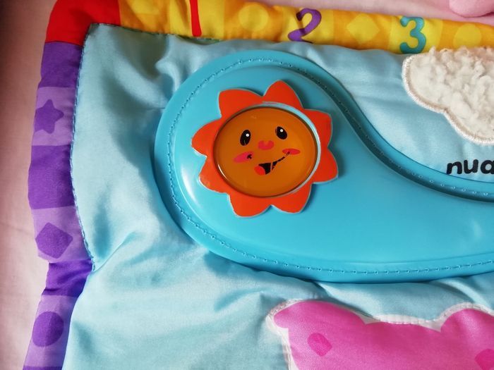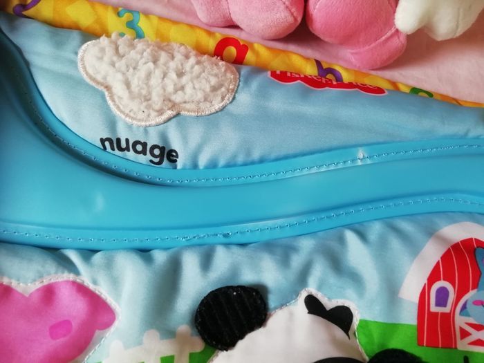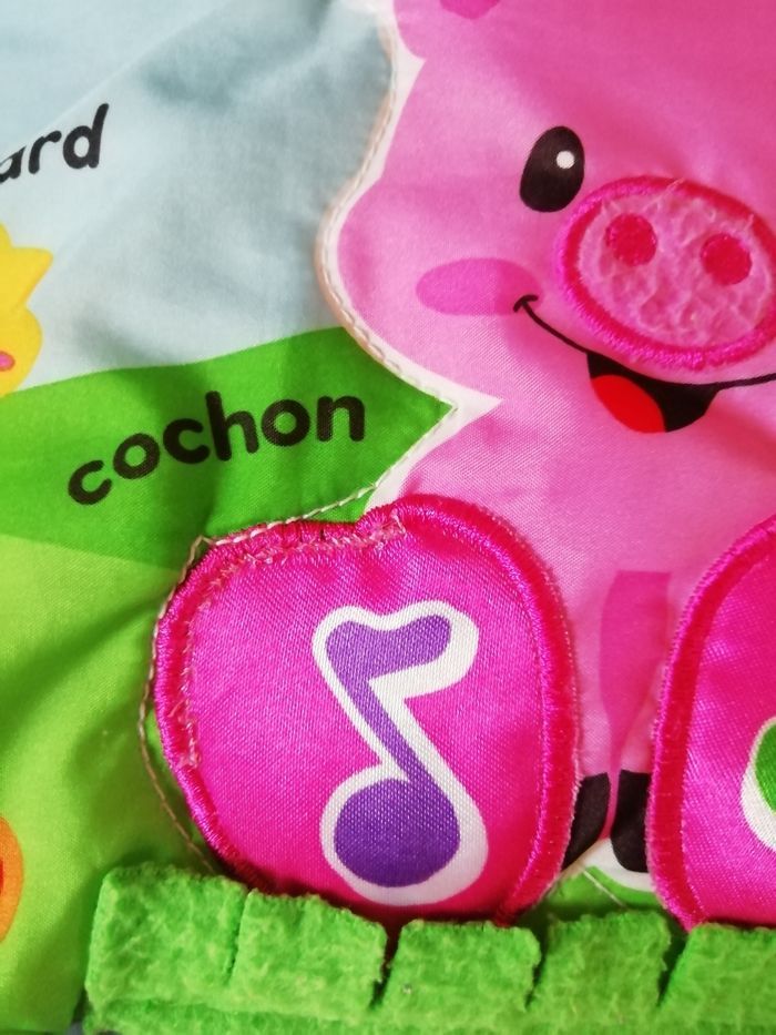 Tableau des animaux est conçu pour stimuler le développement des sens des nouveau-nées et les amuser avec des sons et de nombreuses activités. Il propose 10min de musique donc 2 chansons, 4 mélodies, des noms d'animaux et des effets sonores. Bébé déclenche la musique en appuyant avec ces mains ou et ces pieds sur les animaux de la ferme. Bébé explore également de nouvelles texture et découvre les noms des animaux. Il a était recousu ce voie légèrement voir photo.