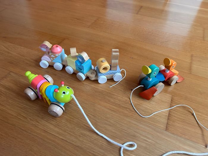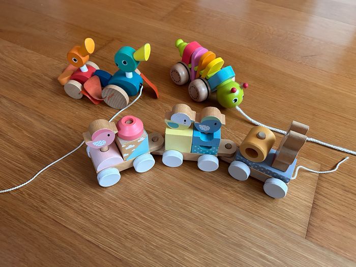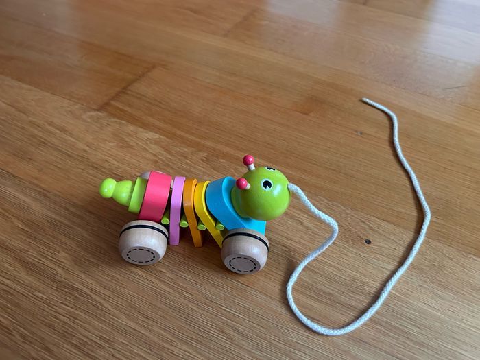 Jouet chenille en bois à traîner.