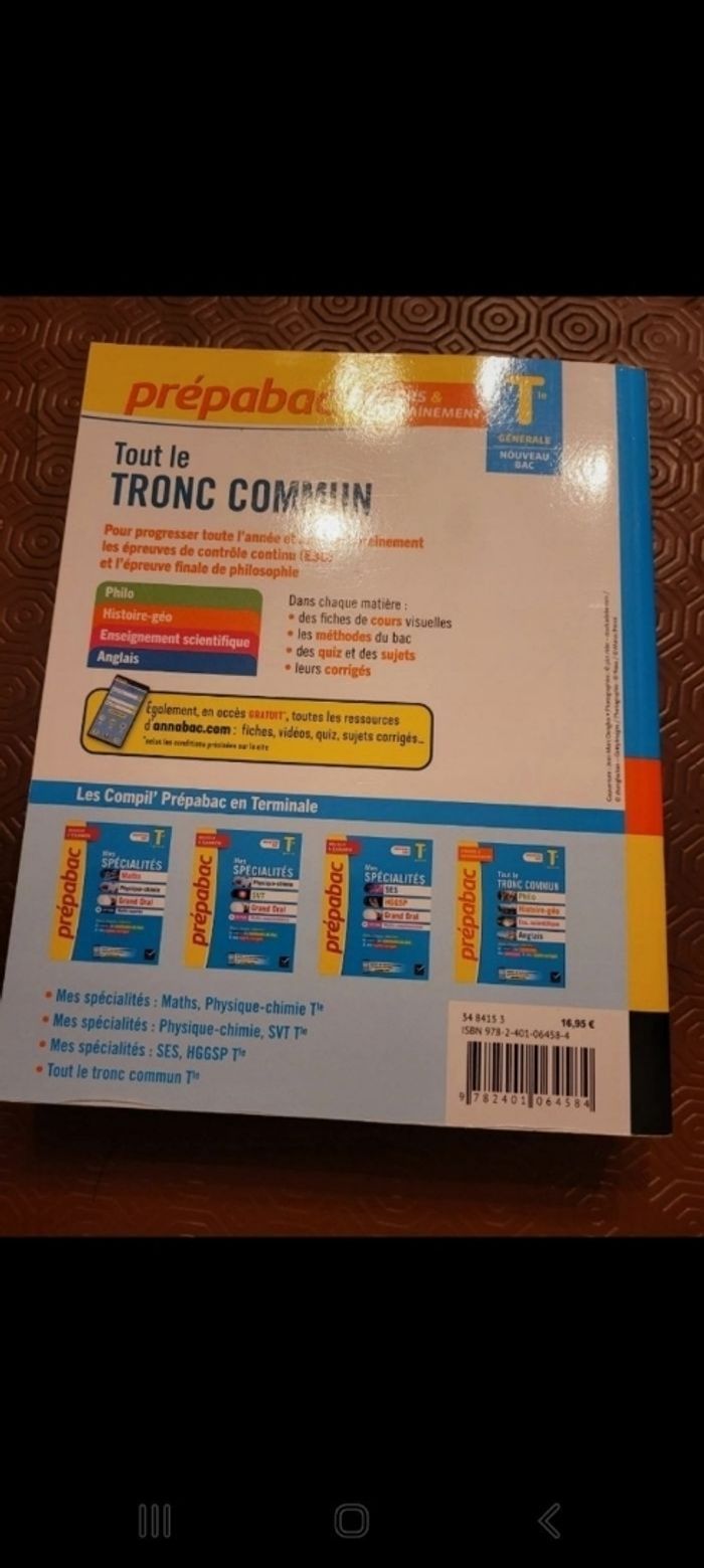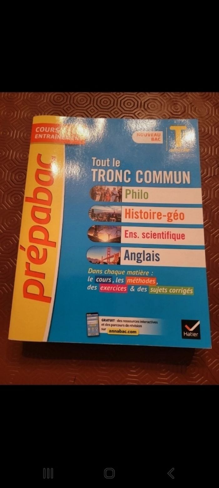 A vendre manuel de préparation au bac englobant histoire géographie la philosophie l'anglais et l'enseignement scientifique pour terminale générale en parfait état ouvert 1fois. Prix :5euros