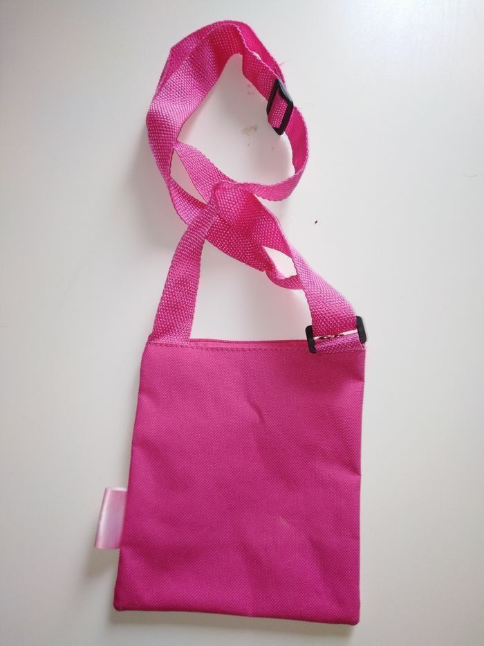 Pochette bandoulière de 14x16, fermeture eclair sur le dessus pour fermer le sac, coloris rose, flocage nikel. 1 autre minnie également à vendre ds mon dressing ainsi que puzzles, livres, jouets le tout a prix tout doux. J'envoie le colis le jour mm ou le lendemain de l'achat.