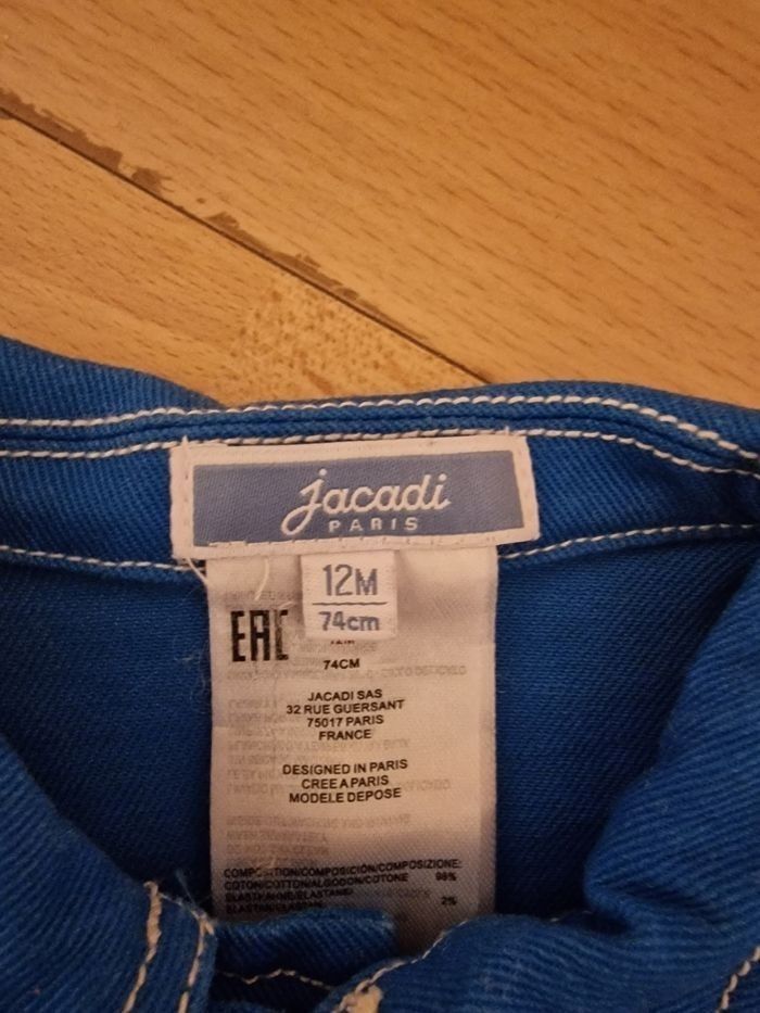 Ensemble jacadi en taille 12 mois (74cm) Petite veste en jeans et short assorti . Pressions sur la veste et pour la fermeture du pantalon Comme Neuf.