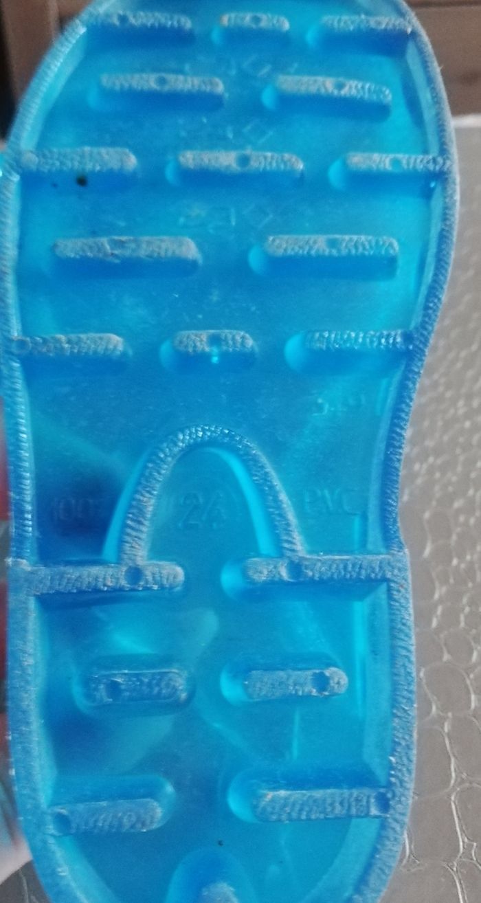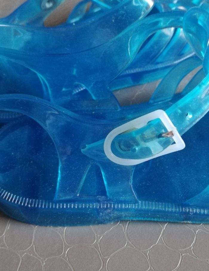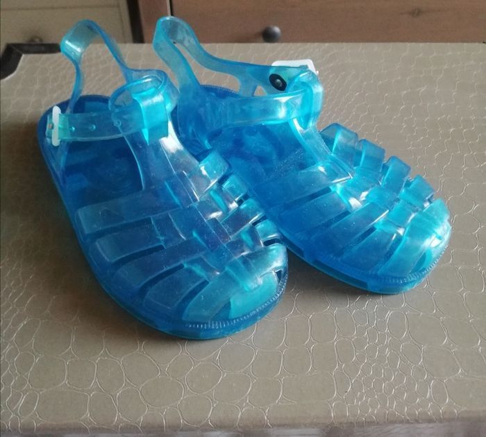 Vends des sandales méduse en plastique bleu de taille 24 avec attache sur le côté.