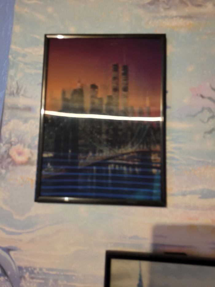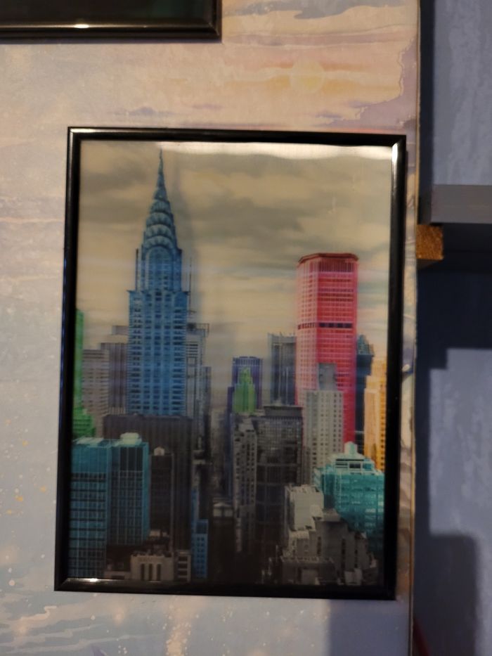 “Tableau déco moderne rose/violet – visage & skyline tendance